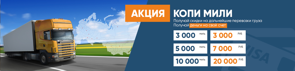 Для того что бы стать участником акции, необходимо об этом сообщить вашему персональному менеджеру. Вас сразу внесут в список участников акции, о чем вас проинформирует смс. Мили будут начисляться за каждый перевезенный груз в зависимости от расстояния маршрута. Расстояние берется из расчета маршрута в яндекс картах. После получения денежных средств по заключенным заявкам вам будут зачисляться мили на ваш личный счет. Километры переводятся в мили из расчета 1 миля - 1,6 км.