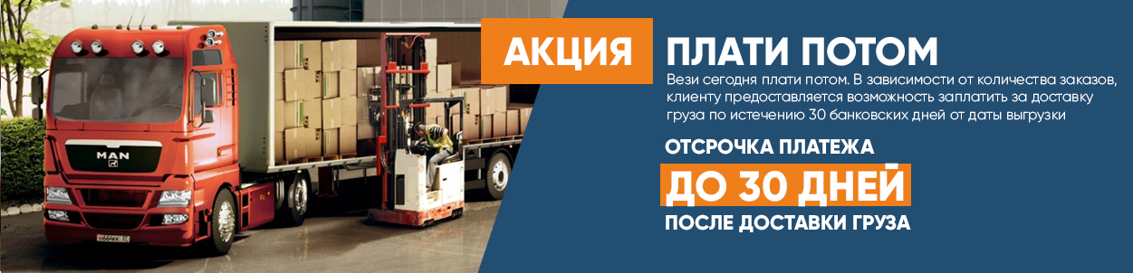 Вези сегодня плати потом. Каждому клиенту предоставляется возможность заплатить за доставку груза по прошествию 5 банковских дней от даты выгрузки автомобиля. Заказывай у нас чаще и получай более длительные сроки отсрочки платежа. Подробности акции узнай у своего персонального менеджера